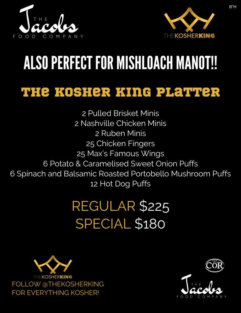 PURIM 2026 Click to order! THE KOSHER KING PLATTER IS THE PERFECT MISHLOACH MANOT AND WE DELIVER! Click to order!